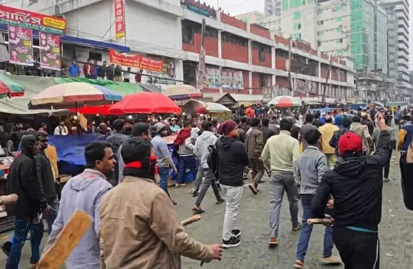 Traders came under attack on Monday while staging an anti-extortion human chain in the capital’s Karwan Bazar area.